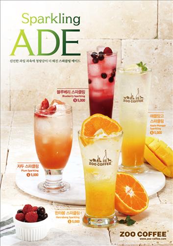 주커피(ZOO COFFEE)는 지난 13일 다양한 과일향에 탄산수를 더한 '스파클링 에이드'를 내놨다. 종류는 애플망고·블루베리·한라봉·자두·오렌지·로즈마리 레몬 등 여섯 가지.