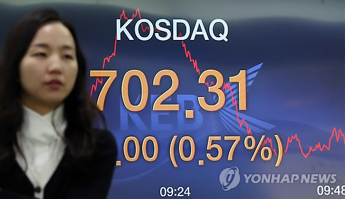 | △ 코스닥, 7년 3개월 만에 700선 돌파 (서울=연합뉴스) 이지은 기자 = 코스닥지수가 7년 3개월 만에 장중 700선을 돌파한 17일 오전 서울 중구 외환은행 딜링룸에서 한 직원이 전광판 앞을 지나고 있다. |
