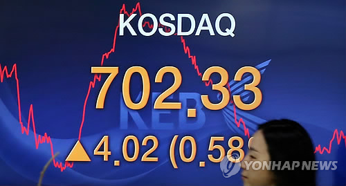 | △ 코스닥, 장중 700선 돌파 (서울=연합뉴스) 이지은 기자 = 코스닥지수가 7년 3개월 만에 장중 700선을 돌파한 17일 오전 서울 중구 외환은행 딜링룸에서 한 직원이 전광판 앞을 지나고 있다. |