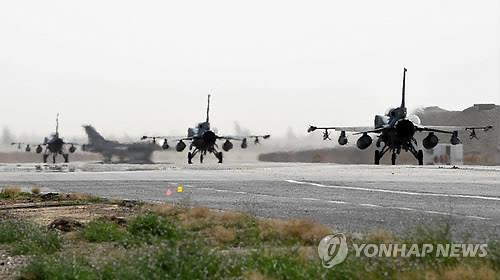 | △ 지난 2월 이슬람국가(IS) 공습을 위해 요르단 기지에서 출격하는 아랍에미리트의 F-16.(AP=연합뉴스) |