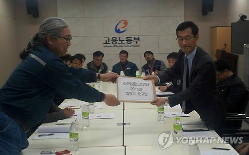 | △ 조선업종 노조, 정부에 '고용안정 보장' 공동요구 (울산=연합뉴스) 장영은 기자 = 전국 조선사업장 노조가 현재 조선업종에서 일어나는 구조조정의 중단과 고용안정을 보장해달라고 정부에 요구했다. 조선업종 노조연대의 공동의장인 정병모 현대중공업 위원장(왼쪽)이 지난 25일 고용노동부 관계자에게 이 같은 내용의 대정부 공동요구안을 전달했다. 2015.3.26 << 현대중공업노조 제공 >> young@yna.co.kr |