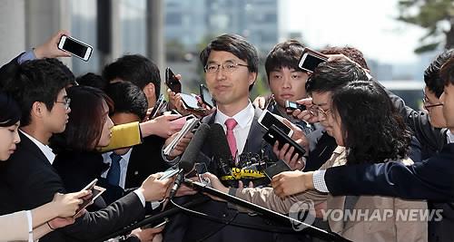 | △ 질문세례 (서울=연합뉴스) 신준희 기자 = 故 성완종 전 경남그룹 회장의 최측근으로 알려진 박준호 전 상무가 21일 오후 참고인 조사를 위해 서초동 고등검찰청으로 들어가던 중 취재진의 질문을 받고 있다. |