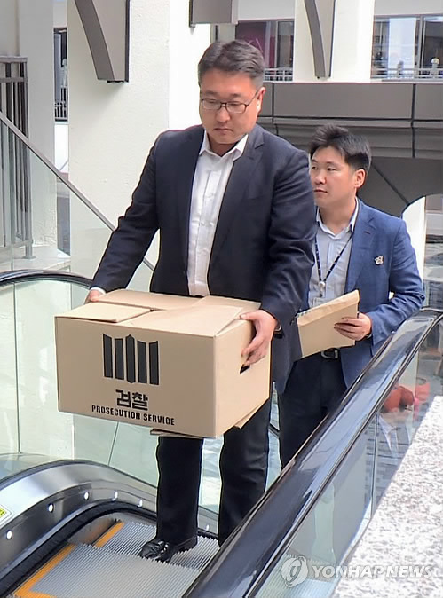 | △ 검찰, 동부산관광단지 점포 압수수색 (부산=연합뉴스) 동부산관광단지 금품 비리를 수사하는 부산지검이 21일 부산시 기장군에 있는 동부산관광단지 내 롯데몰 동부산점의 한 점포를 압수수색, 자료를 들고 나오고 있다. 이 점포는 부산도시공사 전직 고위 임원의 가족이 임차해 운영하는 것으로 알려졌다. 2015.4.21 << 연합뉴스TV 캡처 >> osh9981@yna.co.kr |