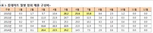 특히 2010년 각각 5.7%, 10.4%에 불과했던 3월과 4월 매출 비중은 4년새 20.4%, 22.5%로 크게 뛰었다.
