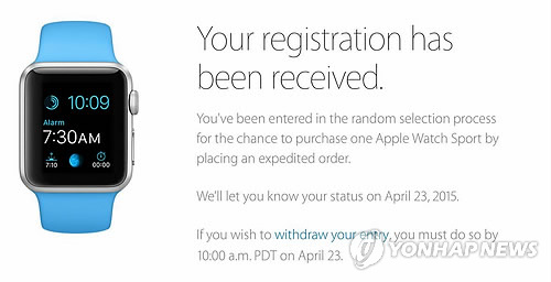 (샌프란시스코=연합뉴스) 임화섭 특파원 = 애플의 스마트시계 '애플 워치'의 초기 물량이 예약주문 첫날인 지난 10일 불과 6시간만에 모든 모델에 걸쳐 품절됐다.