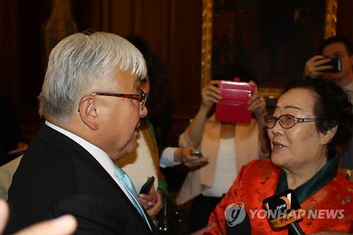 | △ 손맞잡은 마이크 혼다 의원과 이용수 위안부 할머니 (워싱턴=연합뉴스) 노효동 특파원 = 지난 2007년 미국 하원의 일본군 위안부 결의안 통과의 주역인 마이크 혼다(민주·캘리포니아) 의원과 같은 해 미국 하원 청문회에 나와 증언했던 일본군 위안부 피해자 이용수(87) 할머니가 21일(현지시각) 미국 하원에서 만나 반갑게 손을 맞잡고 있다. 2015.4.22 rhd@yna.co.kr |