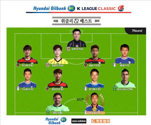 위클리 베스트 11 공격수로는 정대세와 에두(전북)가, 미드필더로는 레오나르도(전북), 염기훈(수원), 문창진(포항), 이상호(수원)가 선정됐다.