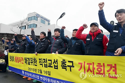 | △ 구호 외치는 현대차 비정규직노조 (울산=연합뉴스) 김근주 기자 = 현대차 울산공장 비정규직 노조 조합원들이 16일 현대차 울산공장 앞에서 사측에 독자교섭을 요구하며 구호를 외치고 있다. 2015.2.16 canto@yna.co.kr |