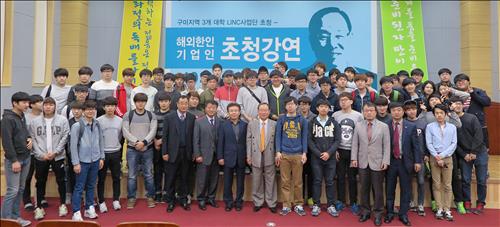 | △ 이영현 캐나다 영리무역 회장은 22일 경북 구미시 IT의료융합기술센터 강당에서 금오공대, 구미대, 경운대 학생 250여 명에게 자신의 성공 노하우를 전수했다. |