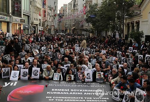 | △ 1차세계대전 때 터키의 전신 오스만제국에 의해 자행된 아르메니아인 대규모 살해 사건의 100주기를 맞아 이를 '집단학살'로 규정하려는 아르메니아 측과 이에 반대하는 터키 간의 갈등이 빚어지고 있다. 사진은 아르메니아 학살 99주기인 지난해 터키 이스탄불에서 항의시위를 벌이는 터키인과 아르메니아인. 2015.4.23 (AP=연합뉴스 자료사진) |