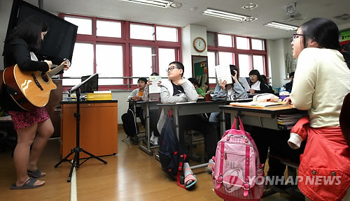 교사는 기타를 치면서 학생들의 수업 참여를 자연스럽게 유도했다.