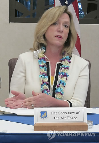 | △ (AP=연합뉴스) 데버러 리 제임스 미국 공군장관이 17일(현지시간) 미국 하와이 공군기지에서 기자회견하고 있다. 이날 제임스 장관은 1년 반 안에 자격을 갖춘 여군에게 공군의 모든 업무를 개방하겠다고 밝혔다. 현재 미국 공군에서 7개 직종은 여성이 근무할 수 없게 돼 있다. Air Force Secretary Deborah Lee James speaks to reporters at Joint Base Pearl Harbor-Hickam in Hawaii on Monday, Nov. 17, 2014. James said she hopes to make all jobs in the service open to qualified women in the next year and a half. (AP Photo/Audrey McAvoy) |