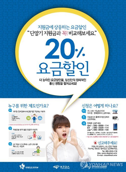 | △ 내일부터 휴대전화 '요금할인율 20%' (서울=연합뉴스) 양정우 기자 = 오는 24일부터 휴대전화 개통 시 '지원금에 상응하는 요금할인율'이 12%에서 20%로 상향된다. 지원금에 상응하는 요금할인은 휴대전화를 개통하면서 지원금을 받지 않는 대신 요금할인 제도를 선택해 내야 할 요금의 20%를 감면받는 것이다. 2015.4.23 << 미래창조과학부 제공 >> eddie@yna.co.kr |