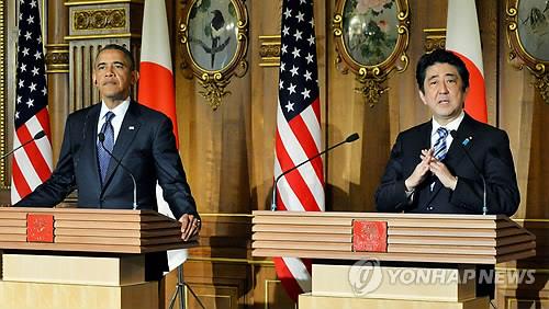 | △ 버락 오바마(왼쪽) 미국 대통령과 아베 신조(安倍晋三) 일본 총리가 2014년 2월 24일 일본 도쿄 영빈관에서 정상회담 공동기자회견을 하고 있다. (교도=연합뉴스DB) |
