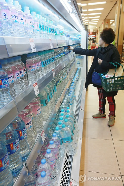 | △ 생수·탄산수 매출 고공행진 (서울=연합뉴스) 박동주 기자 = 업체들의 활발한 홍보와 야외 레저 인구 증가 등에 힘입어 '사먹는 물' 수요가 크게 늘고 있는 가운데 19일 롯데마트 서울역점에서 한 시민이 생수를 사고 있다. 이날 롯데마트에 따르면 이달 들어 17일까지 탄산수 매출은 작년 같은 기간의 3배(197.8%↑)로 늘었다. 생수 매출 증가율 역시 21%로 집계됐다. 2015.3.19 pdj6635@yna.co.kr |