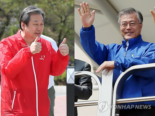 | △ 'D-3'재보선 오리무중 판세 (경기광주 인천=연합뉴스) 백승렬 윤태현 기자 = 4.29 재.보궐 선거의 승부가 사흘 뒤 판가름난다. 26일 김무성 새누리당 대표(왼쪽)가 경기도 광주시 성령교회 앞에서 교인들에게 인사하며 엄지손가락을 들어 보이고 있고, 새정치민주연합 문재인 대표가 인천시 강화군 강화공설운동장에서 열린 '강화 50년생 체육대회'에서 시민을 향해 손을 흔들며 지지를 호소하고 있다. 2015.4.26 srbaek@yna.co.kr tomatoyoon@yna.co.kr |