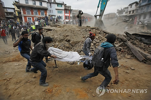 | △ 정부는 대지진이 발생한 네팔 긴급 구호지원을 검토하고 있다. 사진은 네팔을 카트만두의 건물 붕괴 현장에서 발굴된 사망자의 시신을 자원봉사자들이 옮기고 있는 모습. AP=연합뉴스) |