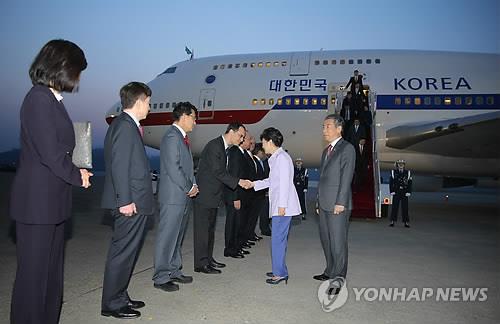 | △ 중남미 4개국 순방을 마친 박근혜 대통령이 '건강 악화'로 국내 현안에 대한 해법이 당분간 미뤄질 전망이다. 사진은 순방을 마친 박대통령이 27일 오전 성남 서울공항에 도착, 환영나온 인사들과 악수를 하고 있다. |