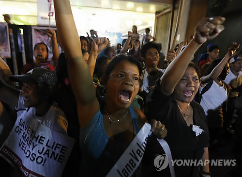 | △ 인니, 외국인 마약사범 7명 사형…필리핀인 제외 (마카티<필리핀> EPA=연합뉴스) 29일(현지시간) 인도네시아 당국이 사형이 예정됐던 필리핀 출신 마약 사범 메리 제인 벨로소를 형 집행 대상에서 제외한다는 소식을 들은 필리핀 시민들이 마카티의 인도네시아 대사관 앞에서 환호하고 있다. 전날 인도네시아 당국이 프랑스, 호주, 브라질, 나이지리아 등 국적의 외국인 7명을 포함한 마약 사범 8명에 대한 총살형을 집행한 가운데 제인 벨로소는 형 집행 직전 마약 운반에 그를 이용한 용의자가 자수했다고 필리핀 정부가 전해옴으로써 집행 대상에서 제외됐다. 2010596@yna.co.kr |