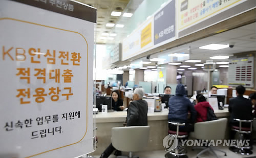 | △ 안심전환대출 출시 여파로 가계대출에서 고정금리가 차지하는 비중이 절반을 넘어서며 사상 최대를 기록했다. 지난 달 27일 서울 KB국민은행 여의도영업부 안심전환대출 전용창구.(연합뉴스 자료사진) |