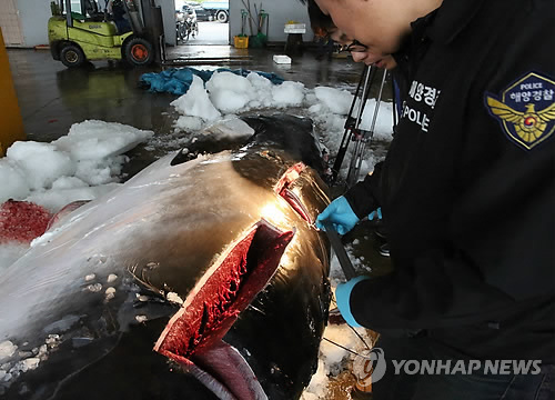 | △ 작살 맞은 밍크고래 조사하는 해경 (울산=연합뉴스) 김용태 기자 = 29일 오전 울산시 동구 방어진항 수협위판장에서 지난 27일 울산 앞바다에서 작살이 꽂혀 죽은 채 발견된 밍크고래를 울산해양경비안전서 관계자들이 조사하고 있다. 이 고래는 경매를 통해 4천300만원에 팔렸으며 판매 수익은 전액 국고에 귀속됐다. 2015.4.29 yongtae@yna.co.kr |