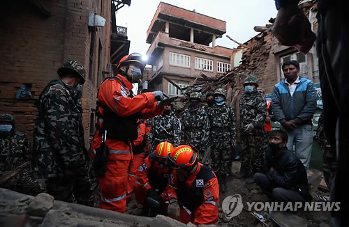 | △ 구조작업 벌이는 119 구조대 (카트만두<네팔>=연합뉴스) 신준희 기자 = 대한민국 중앙 119 구조본부 대원들이 28일 오후(현지시간) 네팔 카트만두 박타푸르 지역에서 내시경을 이용한 수색 작업을 벌이고 있다. 지난 25일 카트만두 북서쪽에서는 진도 7.8 규모의 지진이 발생해 2천명 이상이 사망했으며, 현재까지도 여진이 이어지고 있다. |
