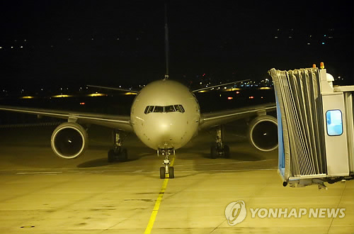 | △ 네팔 지진 발생 후 카트만두발 첫 귀국편인 대한항공 KE696편이 지난 28일 새벽 인천국제공항에 도착하고 있다. |
