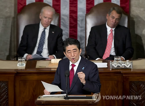 | △ 아베 총리, 미 의회 합동연설 (워싱턴 AP=연합뉴스) 미국 의회에서 아베 신조 일본 총리가 과거 제국주의 식민 지배 피해국인 한국과 중국 등에 대해 분명한 사과 없이 미국에만 고개를 숙이는 이중적 태도를 드러냈다. 아베 총리는 29일(현지시간) 오전 미국 하원 본회의장에서 상하원 합동연설의 무대에 섰다. 상원의장인 조 바이든 부통령(왼쪽)과 존 베이너 하원의장이 듣고 있다. |