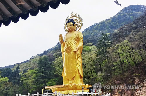 | △ 황금 광채 되찾은 법주사 미륵대불 (보은=연합뉴스) 박병기 기자 = 속리산 법주사의 상징인 미륵대불이 전신에 금박을 입히는 개금불사(改金佛事)를 마무리 짓고 30일 광채 나는 모습을 드러냈다. 2015.4.30 bgipark@yna.co.kr |