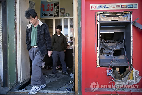 | △ 볼티모어 폭동에 한인업소 약 20곳 피해 (볼티모어 AP=연합뉴스) 미국 메릴랜드주 볼티모어에서 흑인에 대한 경찰의 과잉대응을 규탄하는 시위가 폭동으로 번져 곳곳에서 방화와 약탈이 벌어진 가운데 28일(현지시간) 한국계 주민인 제이슨 박 씨(왼쪽)와 성 강 씨가 약탈당해 엉망이 된 그들의 상점을 둘러본 후 침통한 표정을 짓고 있다. 이번 폭동으로 약 20곳의 한인 업소가 피해를 본 것으로 알려졌다. |