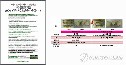 | △ 왼쪽은 종합 일간지에 실린 내츄럴엔도텍의 전면광고, 오른쪽은 한국소비자원에서 배포한 백수오와 이엽우피소를 비교한 자료.(연합뉴스 자료사진) |