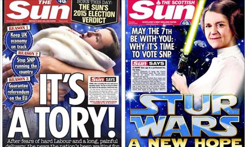 신문은 신생아 모습을 한 보수당 데이비드 캐머런 총리 사진을 싣고 "오랜 산고 끝에" 보수당을 지지하기로 했다고 공개했다.