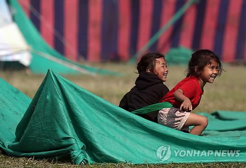 | △ (카트만두<네팔>=연합뉴스) 신준희 기자 = 1일 오전(현지시간) 네팔 카트만두 툰디켈 광장. 지진으로 집을 잃은 아이들이 건물이 없는 광장에 천막을 친 채 놀고 있다. 2015.5.1 |