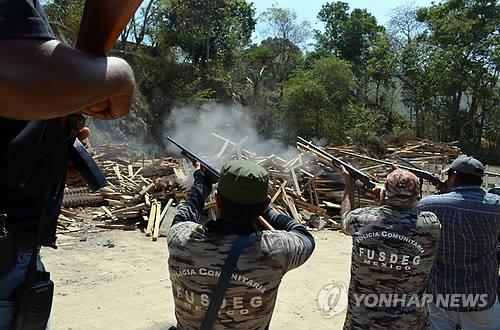 | △ 멕시코 게레로 주의 자경단원들이 지난 2일 경쟁 자경단과의 총격전에서 사망한 단원의 장례식 행사를 거행하고 있다.(AP=연합뉴스DB) |