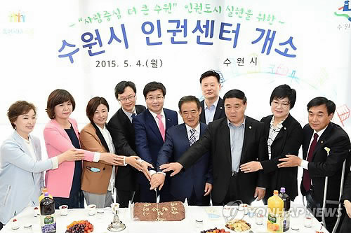 | △ 수원시 인권센터 개소 (수원=연합뉴스) 수원시는 4일 시청 7층 별관에서 염태영 시장 등이 참석한 가운데 '수원시인권센터' 개소식을 했다. 2015.5.4 <<수원시 제공>> kcg33169@yna.co.kr |