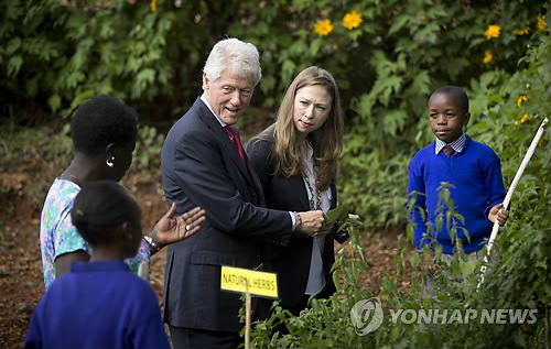 | △ (나이로비 AP=연합뉴스) 빌 클린턴 전 미국 대통령과 딸 첼시 양이 1일(현지시간) 케냐 수도 나이로비에 있는 파라시 레인 초등학교 허브 농장에서 학생 및 교직원과 이야기를 나누고 있다. 클린턴 부녀는 '클린턴재단' 사업 홍보차 케냐를 방문했다. kjw@yna.co.kr |