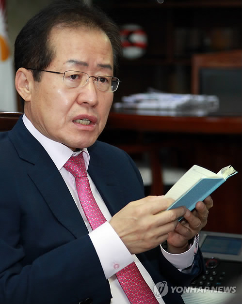 | △ 검찰 수사에 불만…입장 밝히는 홍준표 (창원=연합뉴스) 이정훈 기자 = '성완종' 리스트에 올라 조만간 검찰에 소환될 것으로 알려진 홍준표 경남도지사가 6일 오전 출근하자마자 집무실에서 개최한 기자간담회 도중 수첩을 보면서 검찰 수사에 강한 불만을 표시하고 있다. 2015.5.6 seaman@yna.co.kr |