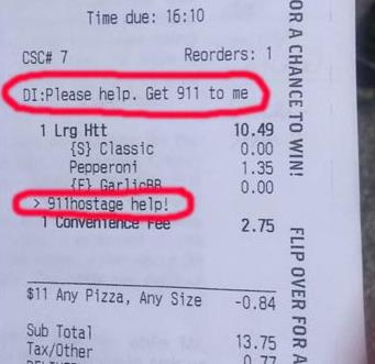 피자 한 판을 주문하고 나서 셰릴은 추가 주문 사항을 적는 란에 "제발 도와주세요. 911 응급구조대를 보내주세요"라고 썼다.