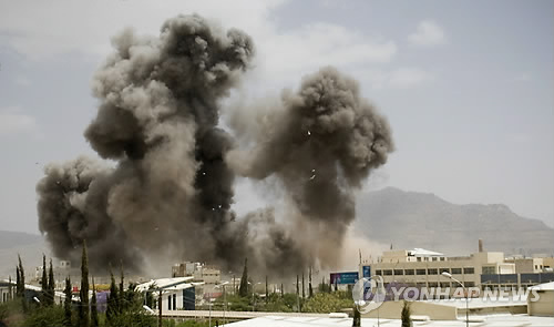 | △ 한달 공습해도 후티 저항 여전 (사나 AP=연합뉴스) 사우디아라비아가 주도한 공습으로 예멘의 사나에서 지난달 8일(현지시간) 연기가 하늘로 치솟는 장면이다. 한달 이상 연합군이 예멘의 시아파 반군 후티에 대해 무자비한 공습으로 피해를 가했지만 반군은 여러 전선에서 여전히 저항하고 있다. |