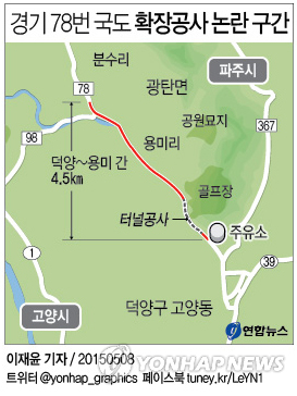 | △ <그래픽> 경기 78번 국도 확장공사 논란 구간 (서울=연합뉴스) 이재윤 기자 = 경기도는 지난 2007년부터 1천100억원을 들여 고양시 고양동과 파주시 용미리를 연결하는 국지도 78호선 덕양∼용미 4.5㎞ 확장 공사를 진행하고 있으나 터널공사로 진·출입로가 막힌 주유소가 막대한 영업피해를 보고 있다. yoon2@yna.co.kr |