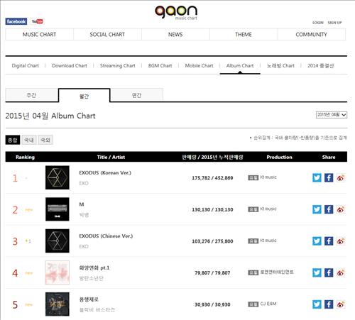 "엑소 2집 판매량 73만장…4월 음반차트 석권"