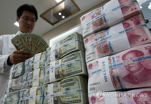 | △ 외환은행 직원이 달러화와 위안화를 정리하고 있다.(연합뉴스 자료사진) |