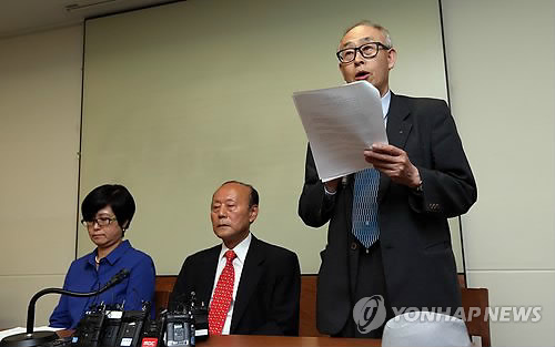 | △ '광복 70년, 615 15년' 남북회의 결과 발표 (서울=연합뉴스) 신준희 기자 = 8일 오후 서울 중구 프란치스코 교육회관에서 열린 '광복70돌, 615공동선언 발표 15돌 민족공동행사 준비위원회' 기자회견에서 상임대표인 이윤배 흥사단 이사장이 남북 합의 결과를 발표하고 있다. 왼쪽부터 김금옥 한국여성단체연합 상임대표과 이창복 615남측위 상임대표. hama@yna.co.kr |