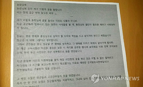그는 이 서신에서 "총장님의 리더십이 땅에 떨어졌다. 이제 그만 책임을 지고 물러나 주십시오"라며 "총장님의 결단을 청와대도, 국방부도 기다리고 있다고 생각한다"고 주장했다.