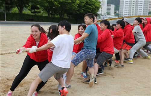 | △ 8일 충남 공주시 공주대 옥룡동캠퍼스에서 열린 재외동포 한마당 체육대회에 참가한 학생들이 줄다리기를 하며 즐거워하고 있다. |