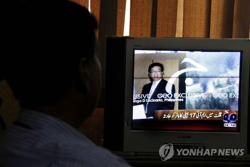 | △ 8일 파키스탄에서 한 남성이 외국 대사 등 7명이 숨진 헬기 추락사고 보도를 지켜보고 있다.(EPA=연합뉴스) |