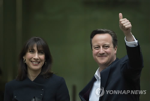 | △ 캐머런 英총리 '기분 최고' (런던 EPA=연합뉴스) 영국 총선에서 완승을 거둔 보수당 대표 데이비드 캐머런 총리(오른쪽)가 부인과 함께 8일(현지시간) 승리 축하 파티에 참석하기 위해 런던에 위치한 당사에 도착해 취재진들에게 엄지를 들어보이고 있다. |