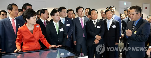 | △ 빅데이터 활용 창업준비생과 대화 (서울=연합뉴스) 백승렬 기자 = 박근혜 대통령이 11일 강원도 춘천시 강원대학교 강원창조경제혁신센터를 방문, 빅데이터 활용한 창업준비생과 대화하고 있다. 2015.5.11 srbaek@yna.co.kr |