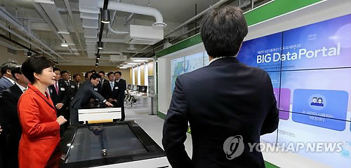 | △ 박 대통령 빅데이터 포털 시연 (서울=연합뉴스) 백승렬 기자 = 박근혜 대통령이 11일 강원도 춘천시 강원대학교 강원창조경제혁신센터를 방문, 빅데이터 포털을 시연해보고 있다. |