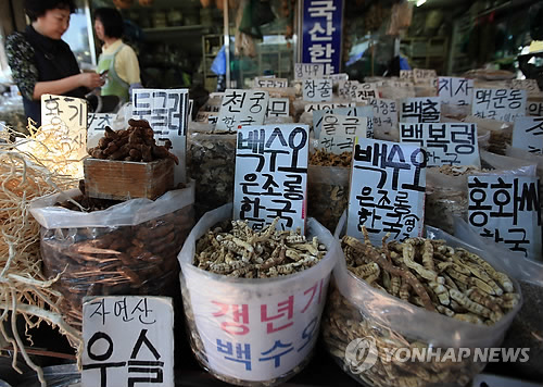 | △ (서울=연합뉴스) 홍해인 기자 = 지난달 30일 서울 동대문구 경동시장 약령시 한 매장에 진열된 백수오와 약재들. 약재상들은 최근 '가짜 백수오' 논란으로 약재시에서 이엽우피소를 찾기 힘들어졌다고 설명했다. 2015.4.30 hihong@yna.co.kr |